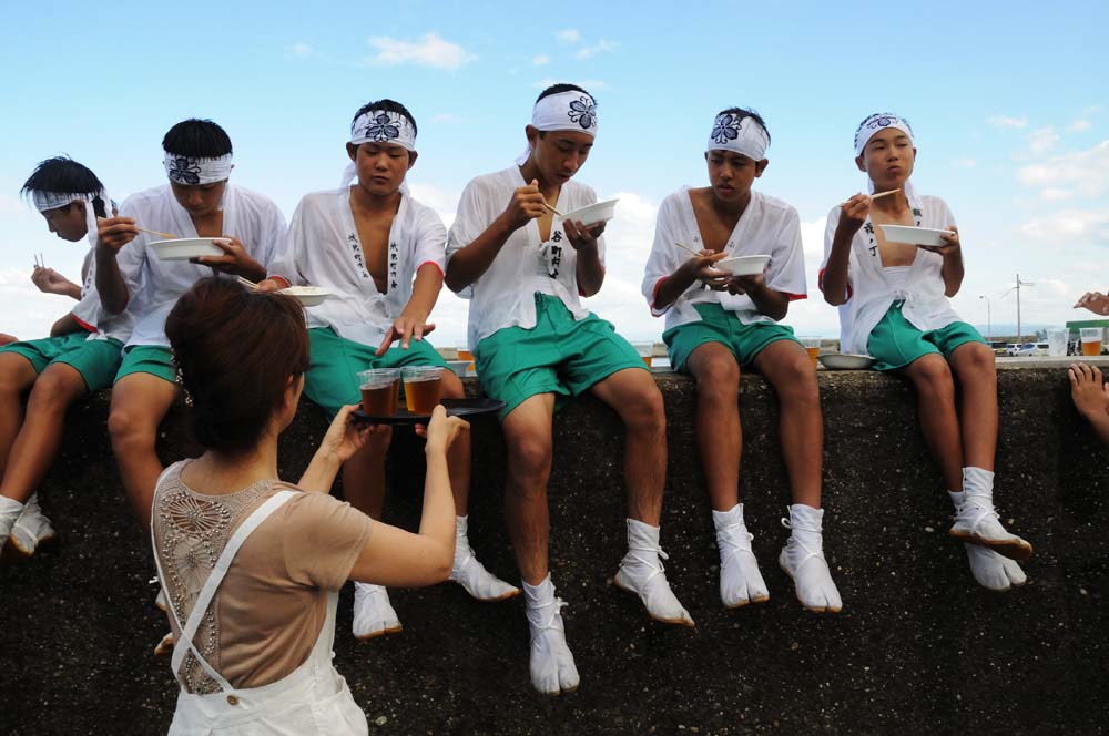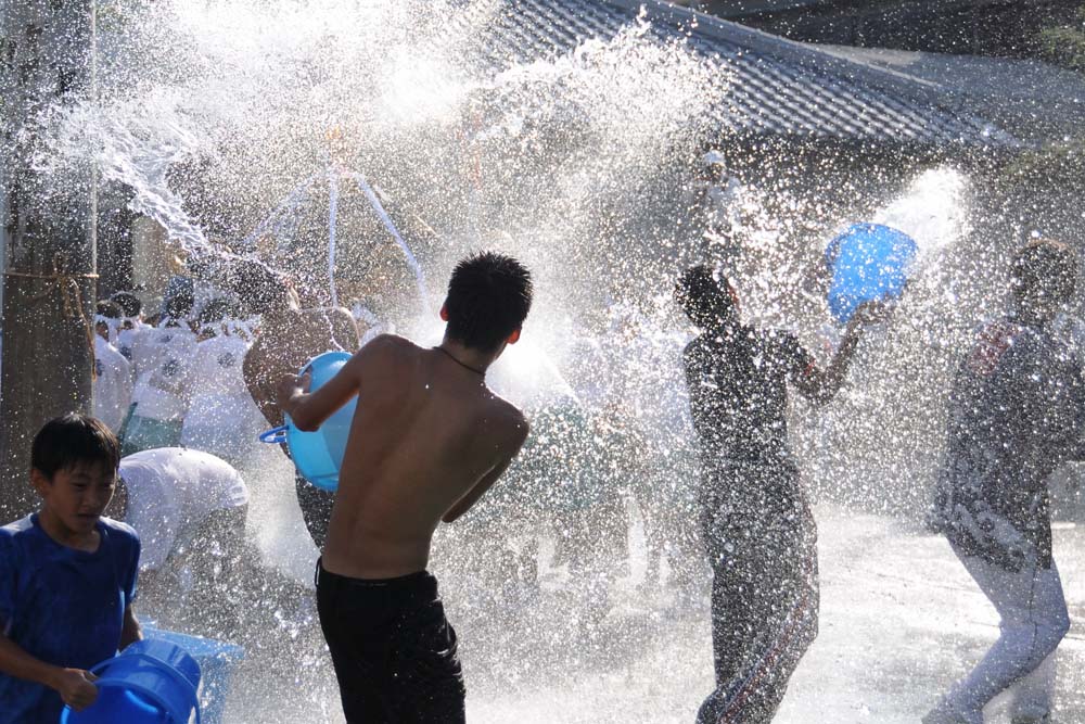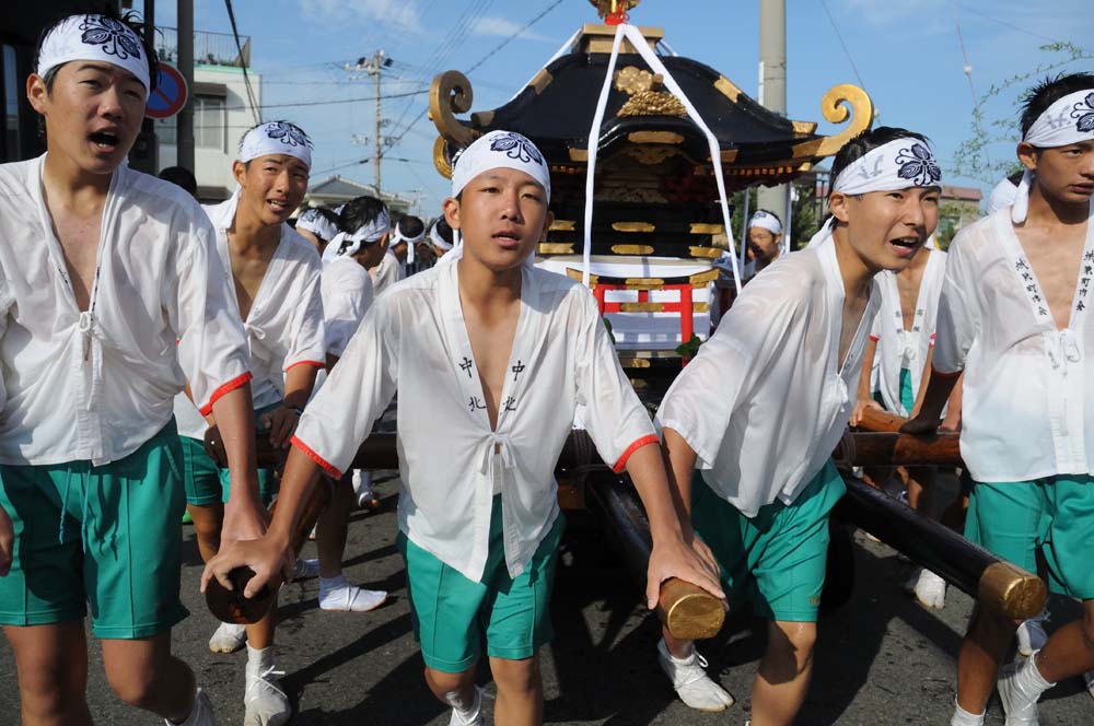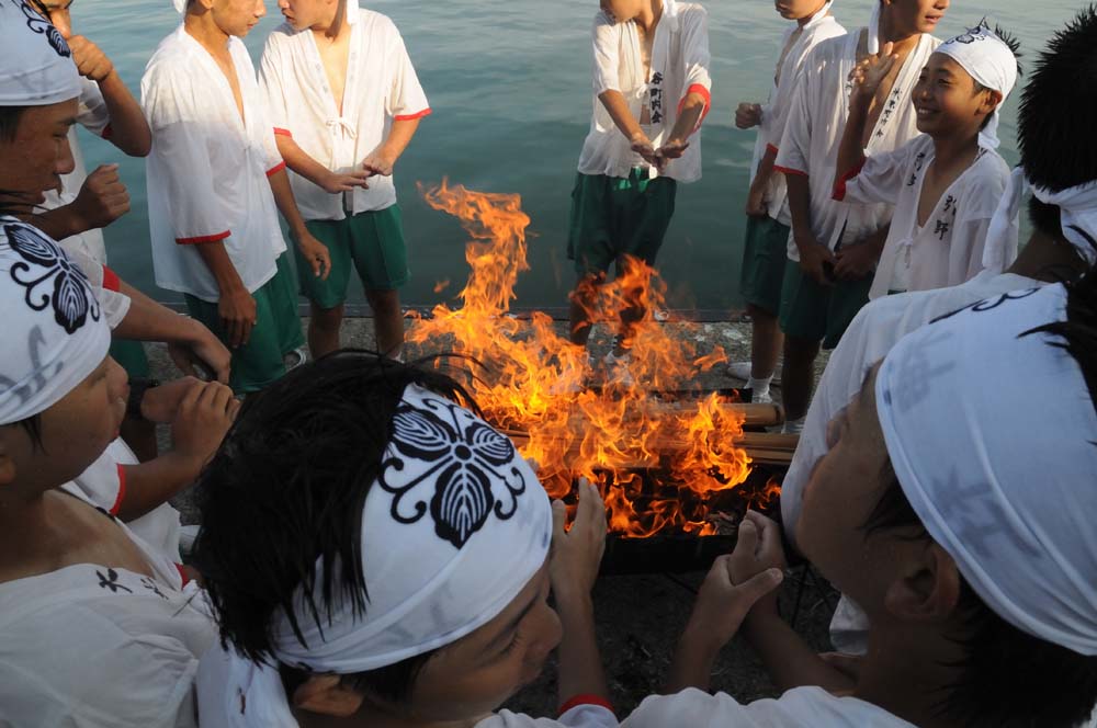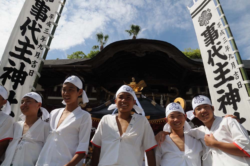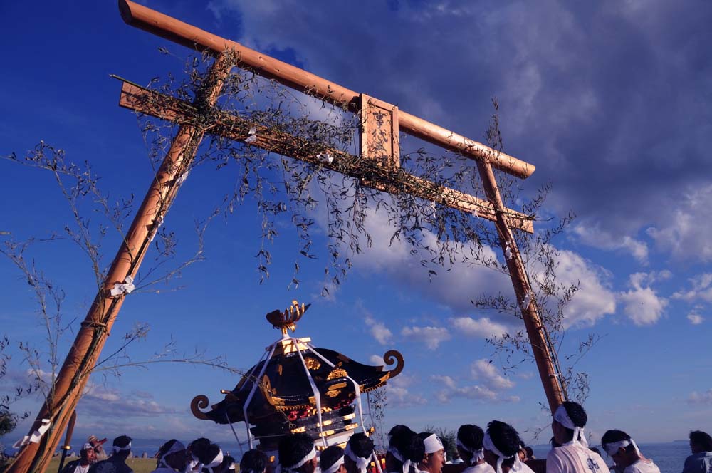 水かけ祭り 淡路市仮屋 水かけ祭り 毎年9月、淡路市仮屋の事代主神社で開催される「水かけ祭り」。勇壮な神輿を担ぐ若者たちに、沿道の観衆が勢いよく水を浴びせ、街中が一体となって盛り上がります。クライマックスは、神輿が海へと飛び込む迫力のシーン。神輿に巻かれた胴巻きは「安産の守り」とされ、これを奪い合う様子から「けんかまつり」とも呼ばれます。地域の伝統と祈り、そして若者たちの熱気が交差する、淡路島を代表する祭礼です。