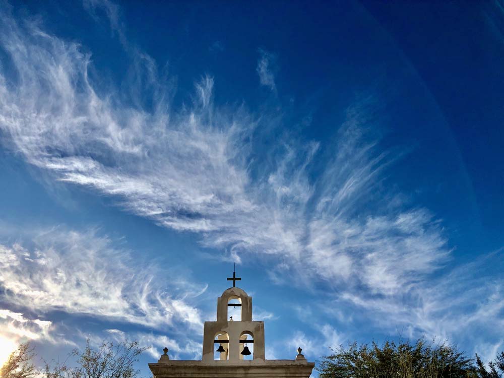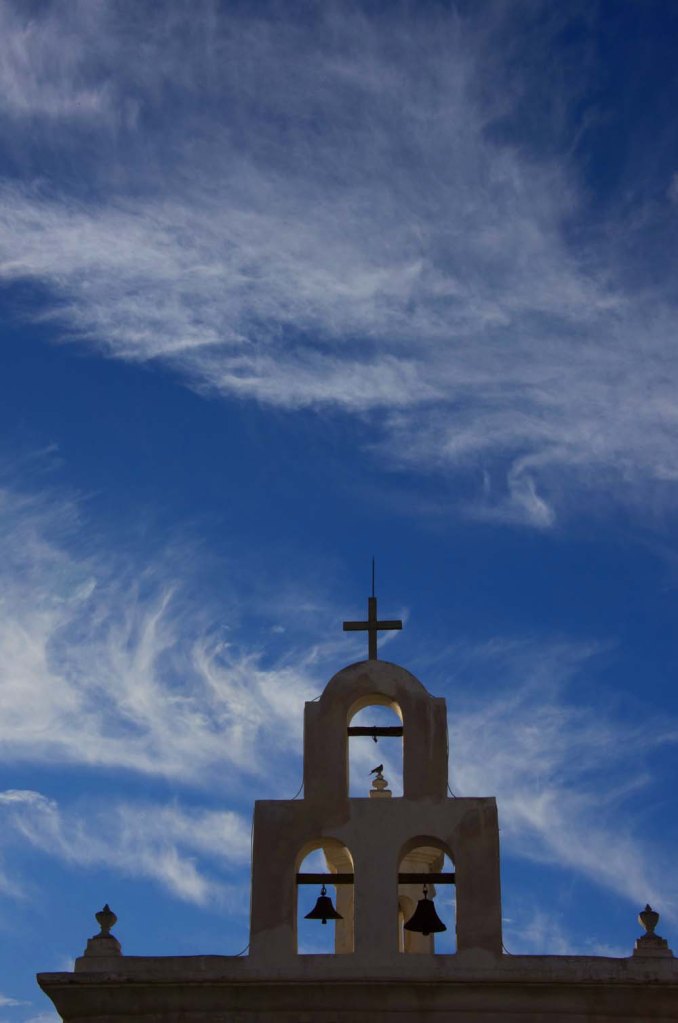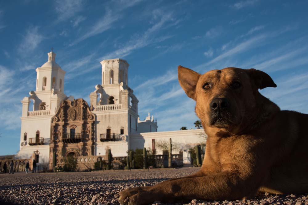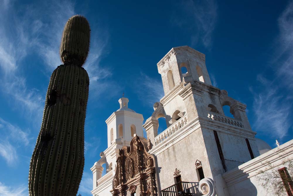 教会 **サン・ザビエル・デル・バク伝道所(San Xavier del Bac Mission)**は、アリゾナ州ツーソンの南に位置する歴史的なカトリック教会です。18世紀後半にスペイン人宣教師フランシスコ・ザビエルの名を冠して建てられました。白亜の外観と、バロック様式の豪華な装飾が特徴で、「砂漠の白い鳩」とも称され印象深い教会でした。