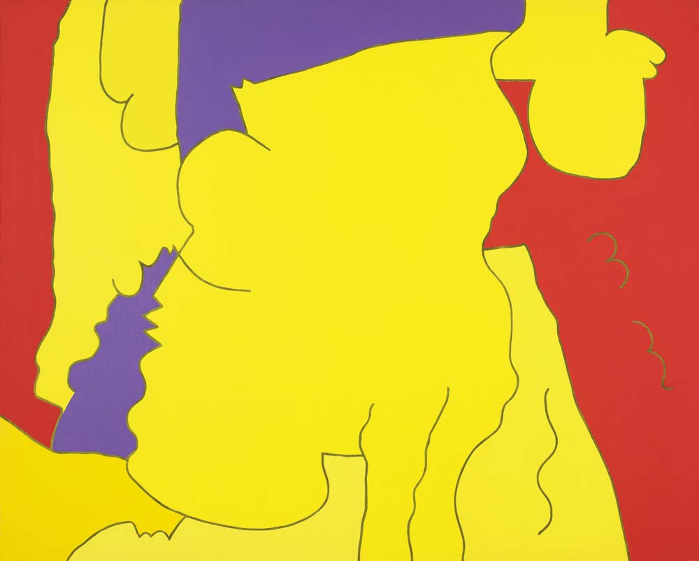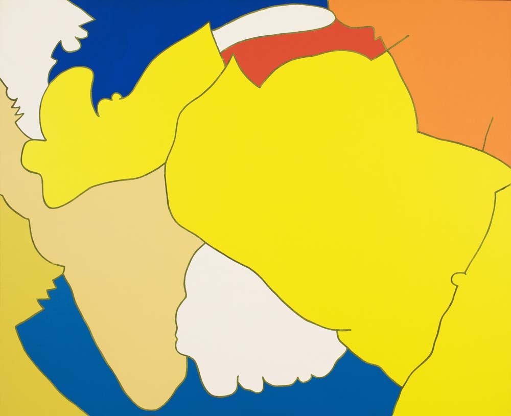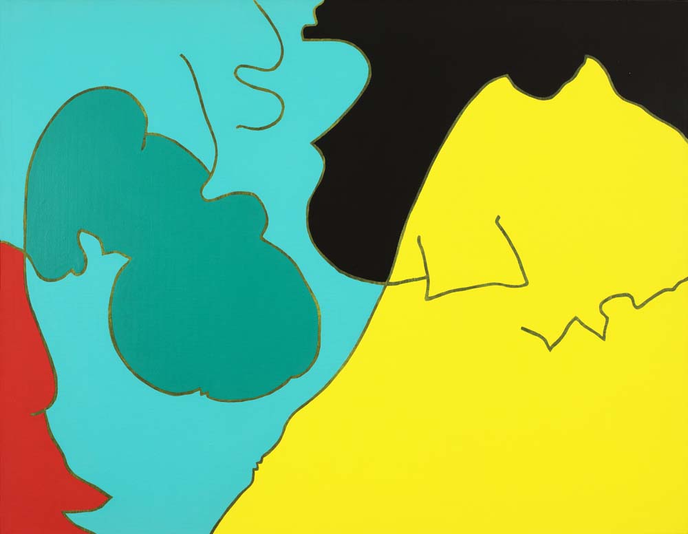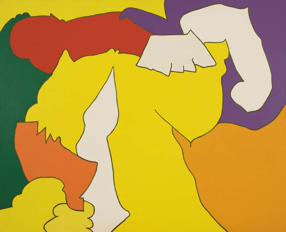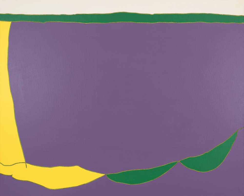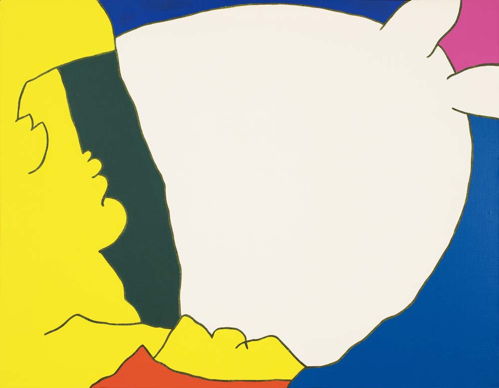 山本の『線と色面』シリーズは、1976年より展開された抽象表現であり、絵画を構成する根源的要素である「線」と「色面」を主軸としている。線は単なる輪郭ではなく、多彩な色を幾重にも重ねることで独立した存在として画面上に脈動し、色面もまた重ね塗りによる深みと鮮やかさを併せ持つ。形象は具体物を連想させず、それ自体が意味から自立した独自の美を築いている。画面には中心や焦点がなく、図と地の区別も曖昧で、形象同士に序列も存在しない。こうした構成によって、山本の作品は無限に広がる視覚世界を提示しつつ、象徴や意味に依らない純粋な美の可能性を追求している。線と色面が織りなすその世界は、遊び心と哲学的深みを併せ持った、独立した芸術世界を構築している。
