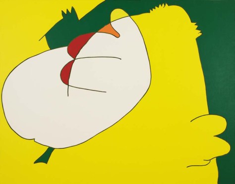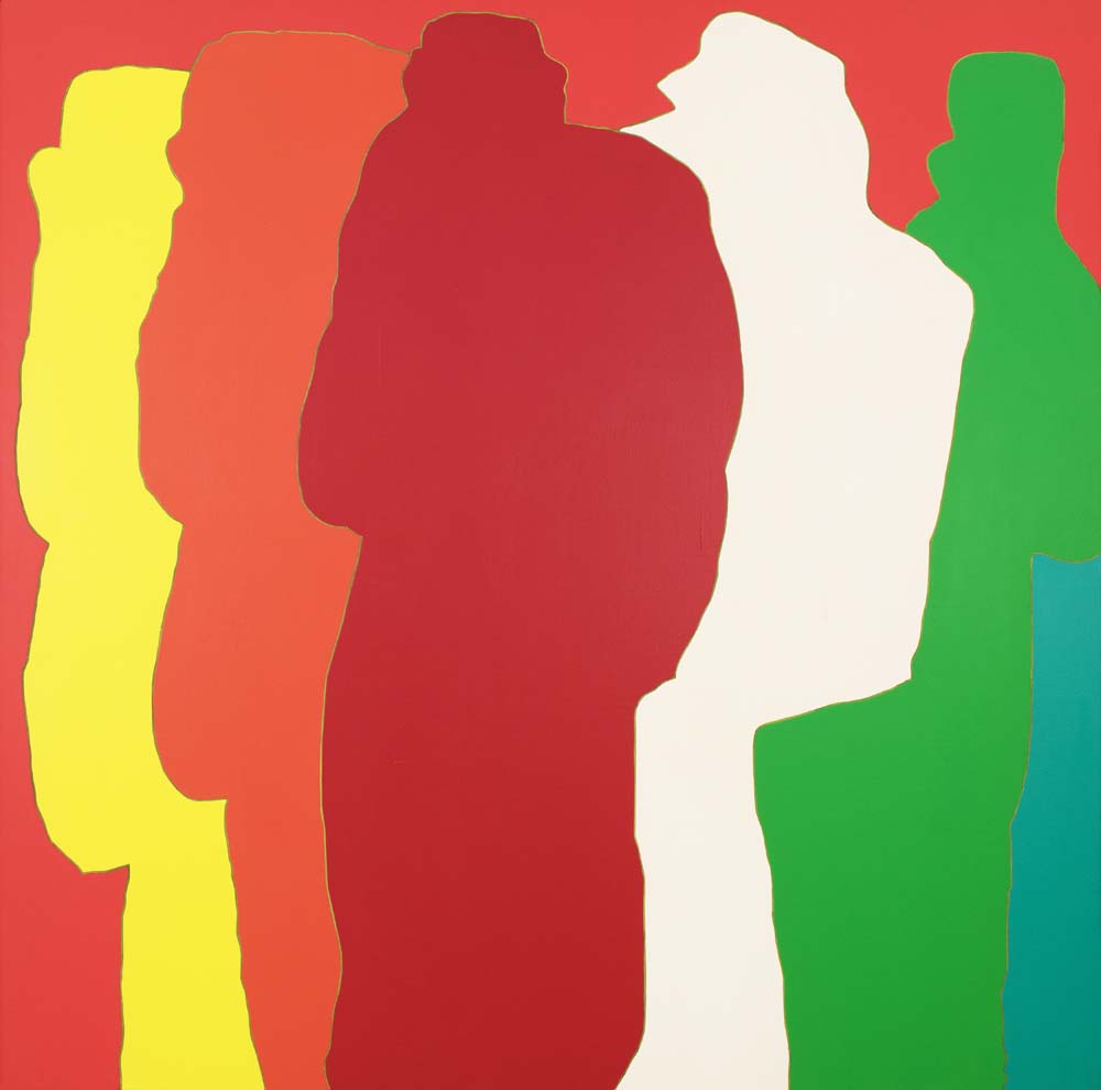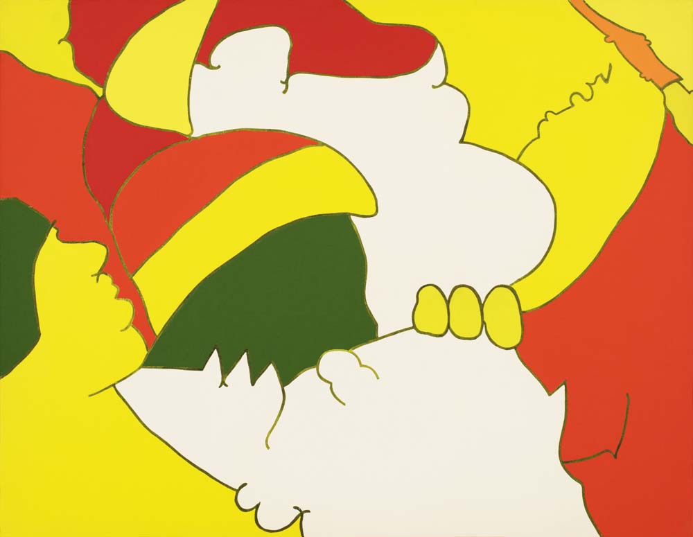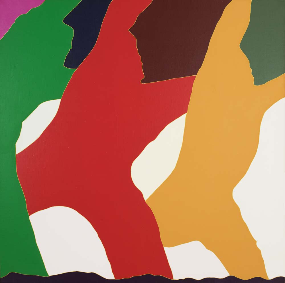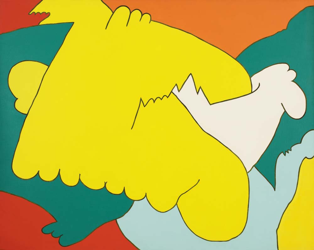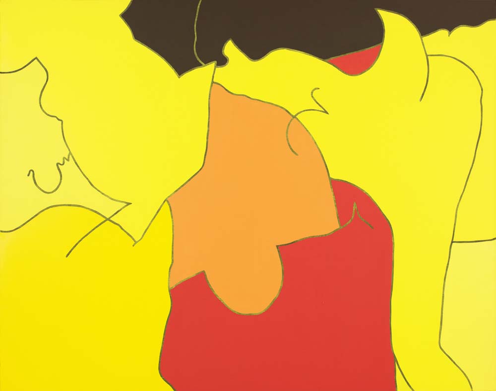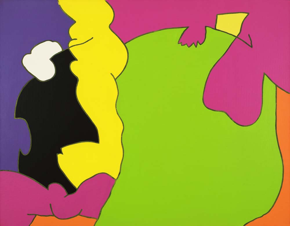 山本の『線と色面』シリーズは、1976年より展開された抽象表現であり、絵画を構成する根源的要素である「線」と「色面」を主軸としている。線は単なる輪郭ではなく、多彩な色を幾重にも重ねることで独立した存在として画面上に脈動し、色面もまた重ね塗りによる深みと鮮やかさを併せ持つ。形象は具体物を連想させず、それ自体が意味から自立した独自の美を築いている。画面には中心や焦点がなく、図と地の区別も曖昧で、形象同士に序列も存在しない。こうした構成によって、山本の作品は無限に広がる視覚世界を提示しつつ、象徴や意味に依らない純粋な美の可能性を追求している。線と色面が織りなすその世界は、遊び心と哲学的深みを併せ持った、独立した芸術世界を構築している。