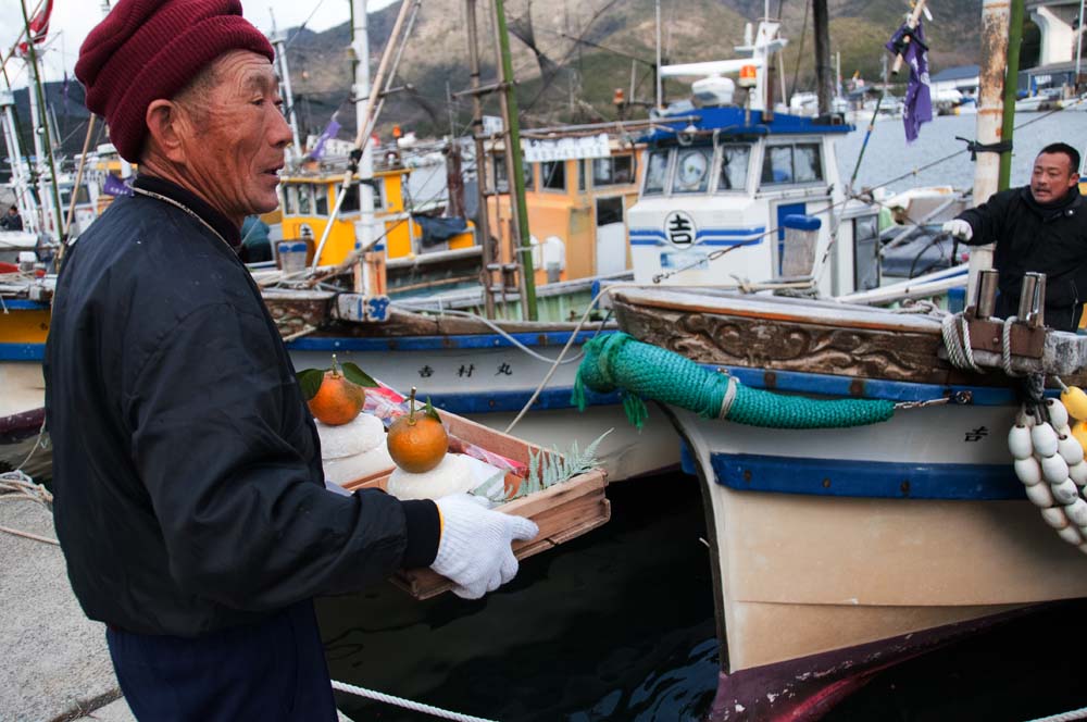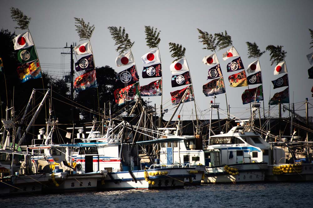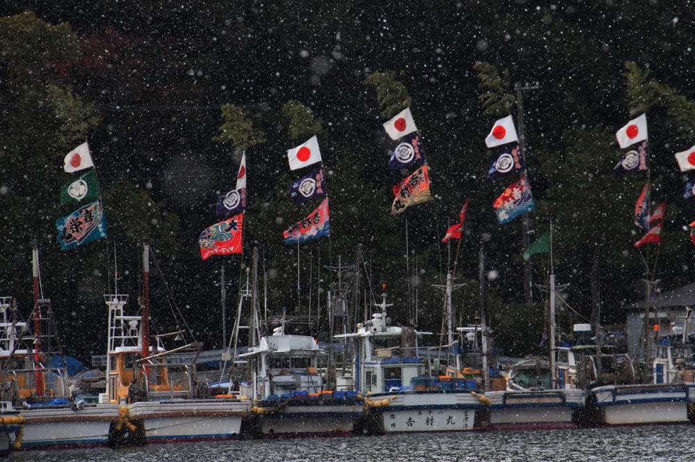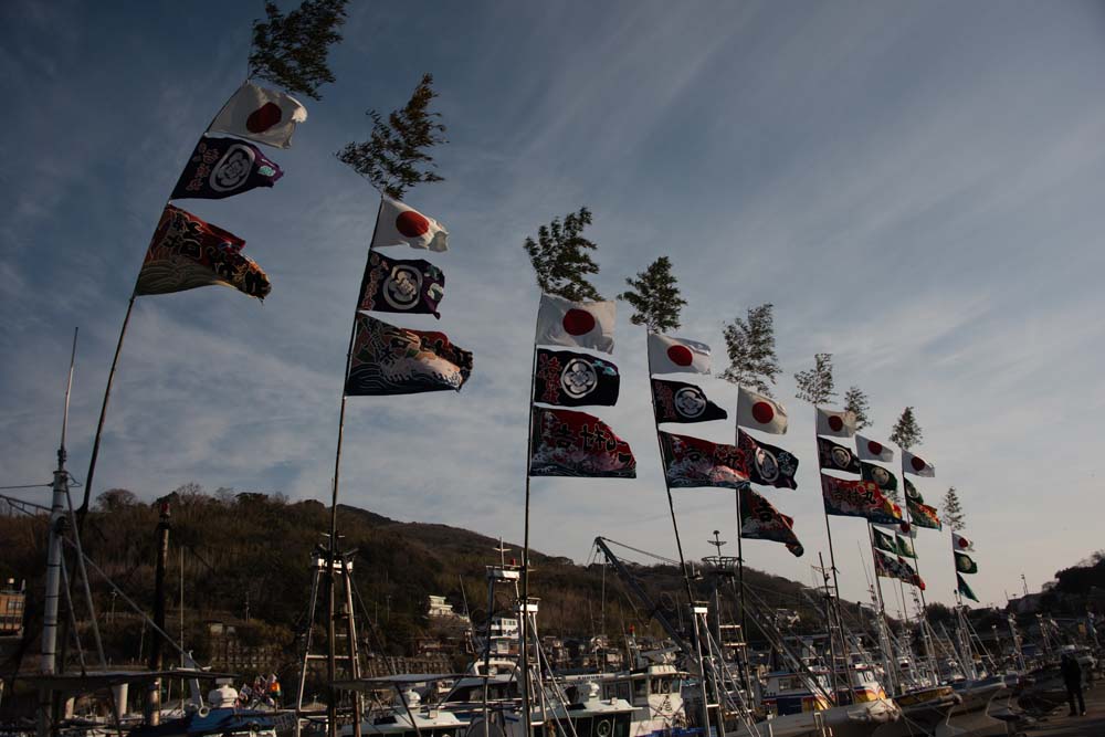 室津 冬 たつの市の室津漁港は、冬の撮影スポットとして多くの写真愛好家に親しまれています。特に元旦から新年初旬にかけて、漁船に掲げられる色鮮やかな大漁旗が見どころです。これらの旗は、漁師たちが新年の豊漁と安全を祈願して掲げるもので、紅白の旗や鯛、宝船などの縁起物が描かれたデザインが特徴です。晴れた冬空の下、漁船のマストにたなびく大漁旗は、港全体を華やかに彩ります。
