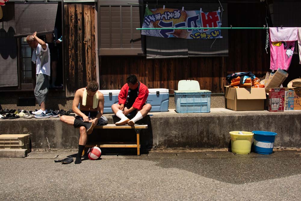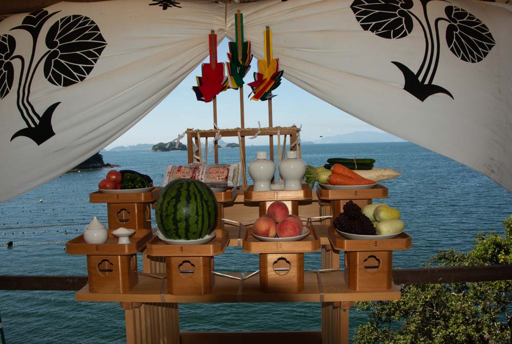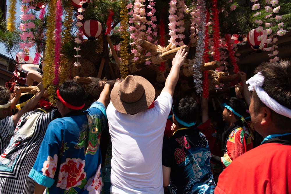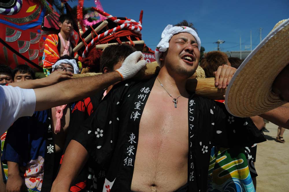 たつの市御津町室津で毎年7月下旬に行われる「夏越祭(なごしまつり)」は、海上安全や大漁、無病息災を祈願する伝統的な祭りです。賀茂神社を中心に開催され、昼と夜に分かれてさまざまな神事が行われます。昼の見どころは、男衆が担ぐ3台の屋台による「屋台練り」。米俵や酒樽、鯛を模した飾りを乗せた屋台が町中を練り歩き、途中で激しくぶつかり合う「練り合わせ」が迫力満点です。夜は「船送り神事」が行われ、人形(ひとがた)に穢れを託して海に流す大祓が神聖な雰囲気の中で執り行われます。また、賀茂神社境内では獅子舞の奉納もあり、地域の伝統芸能が披露されます。春の「小五月祭」と並ぶ、室津を代表する重要な年中行事であり、海の文化と信仰が融合した貴重な祭礼です。