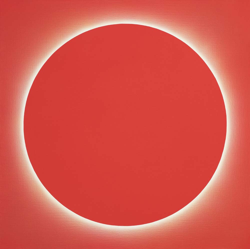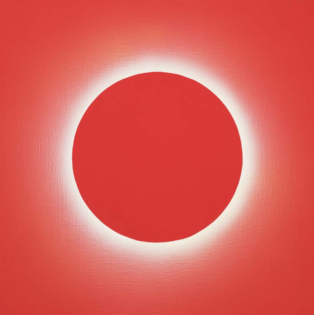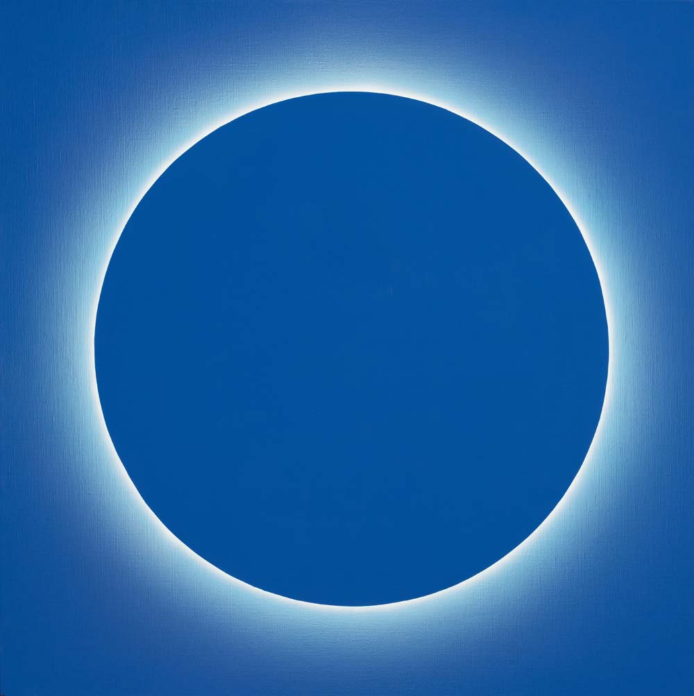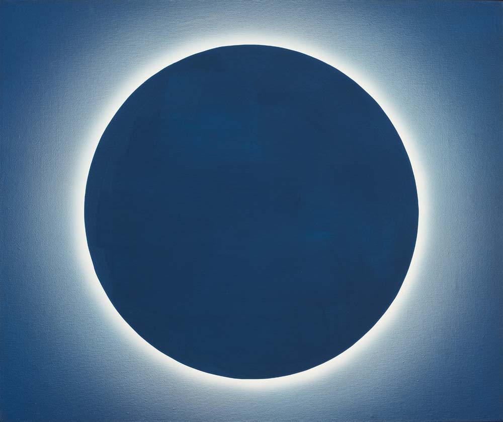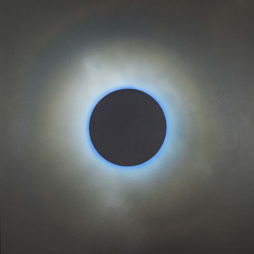 2015年以降、山本は「光」そのものを描くことに挑みはじめました。「光・円環」シリーズに浮かび上がるのは、漆黒や紺碧の深淵に静かに輝く光の輪。それは太陽のコロナのように、あるいは神話の象徴のように、ただそこに在り続けます。温度を持たないその光は、現実を超えた冷ややかな美しさを湛え、色面に永遠の印を刻みます。無限に拡がる平面にふと現れる円環は、中心なき世界に中心を与え、始まりも終わりもない完全な形として、静かに語りかけます。これは描かれたものではなく、現れたもの。絵画という形式を越えて、「美とは何か」「永遠とはどこにあるのか」を問いかける、ひとつの祈りのかたちです。