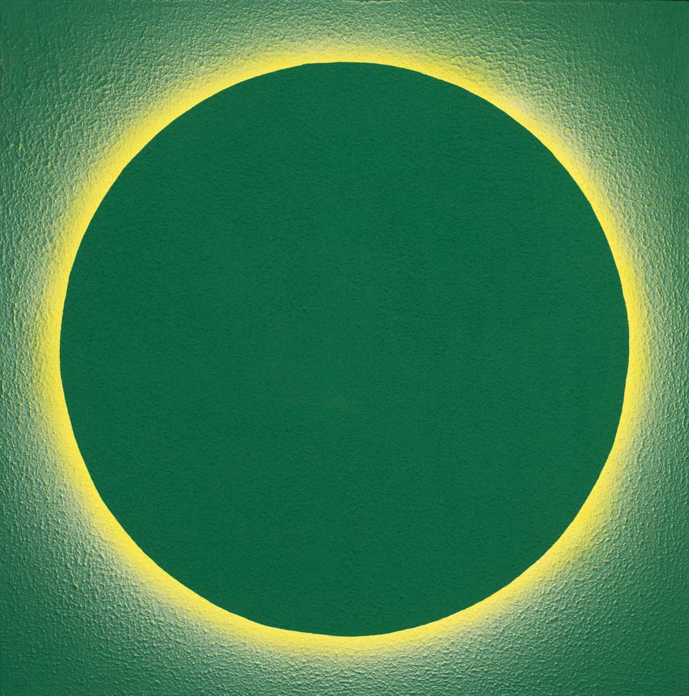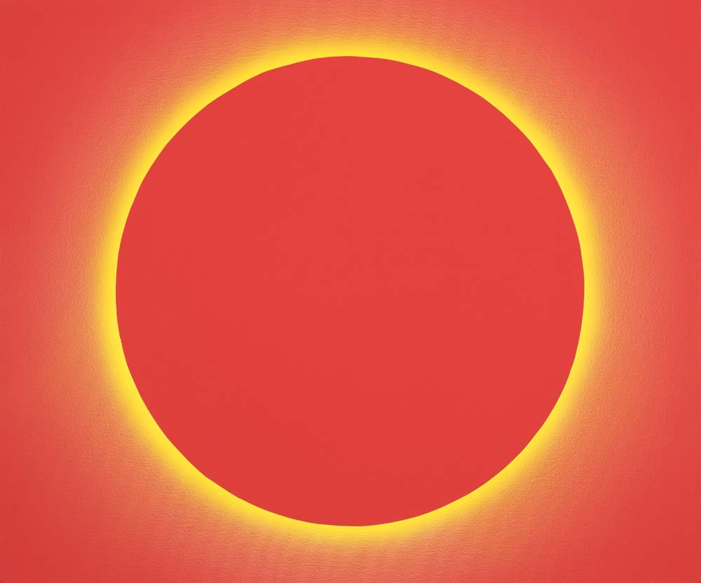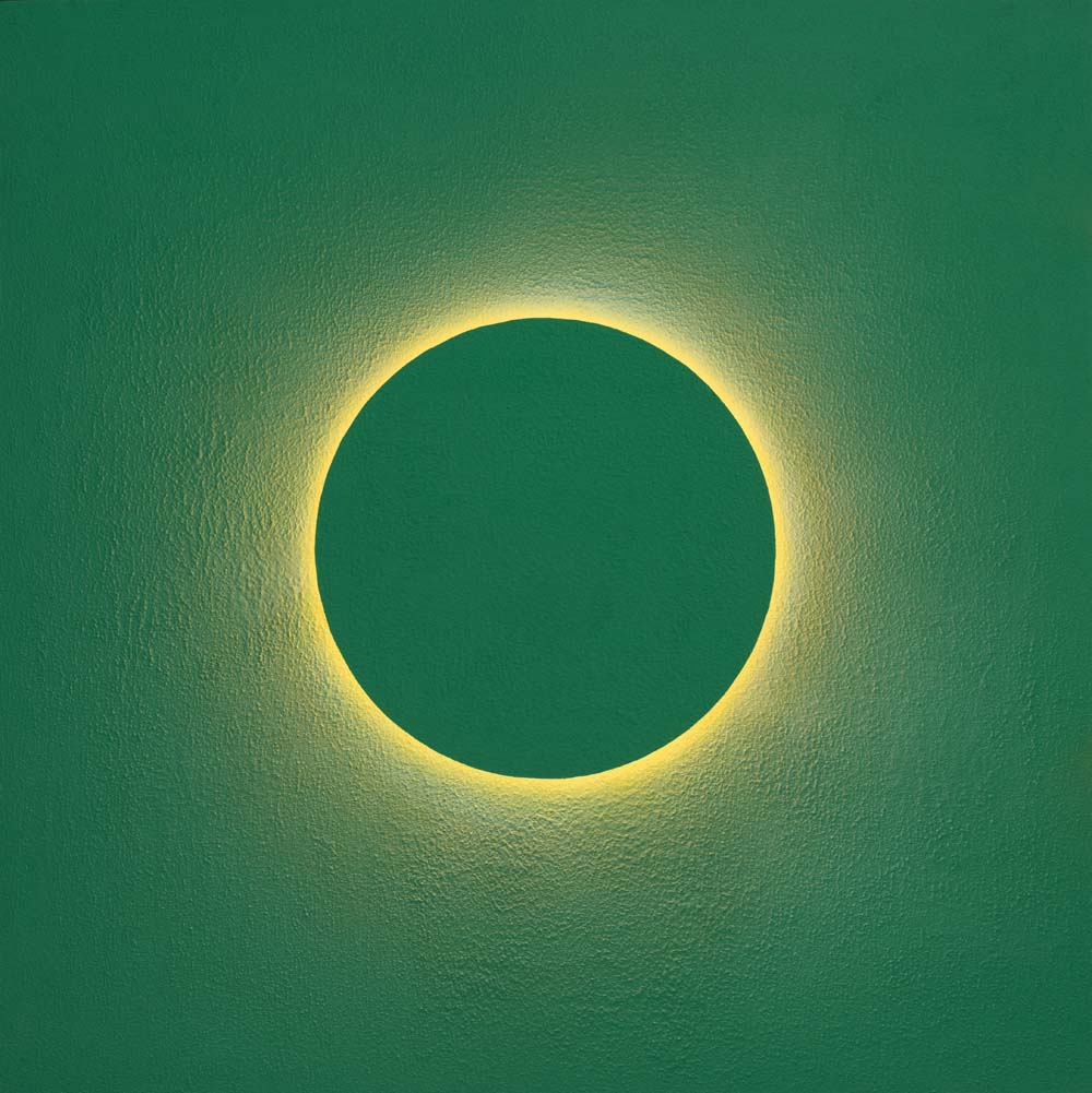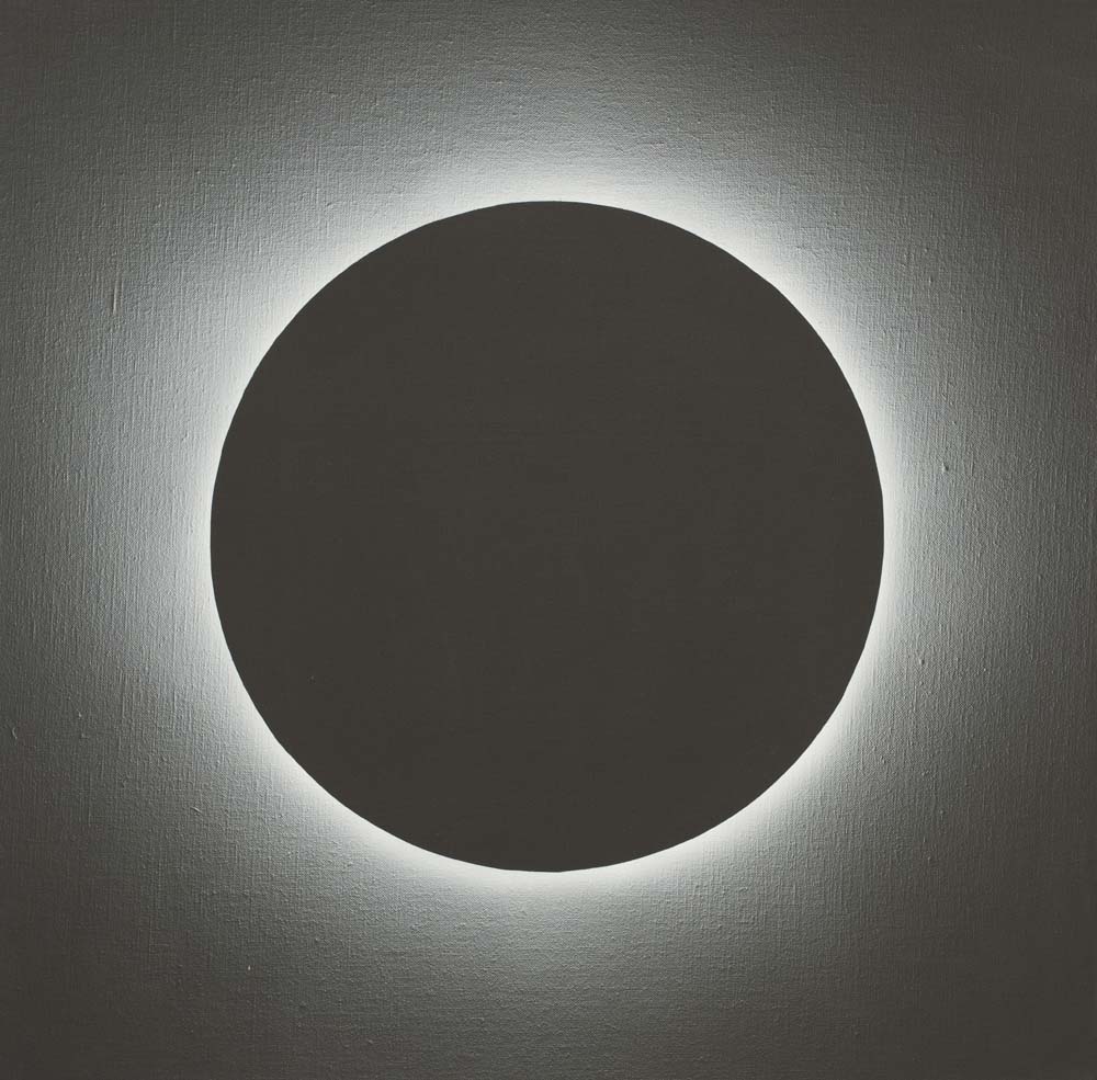 2015年以降、山本は「光」そのものを描くことに挑みはじめました。「光・円環」シリーズに浮かび上がるのは、漆黒や紺碧の深淵に静かに輝く光の輪。それは太陽のコロナのように、あるいは神話の象徴のように、ただそこに在り続けます。温度を持たないその光は、現実を超えた冷ややかな美しさを湛え、色面に永遠の印を刻みます。無限に拡がる平面にふと現れる円環は、中心なき世界に中心を与え、始まりも終わりもない完全な形として、静かに語りかけます。これは描かれたものではなく、現れたもの。絵画という形式を越えて、「美とは何か」「永遠とはどこにあるのか」を問いかける、ひとつの祈りのかたちです。