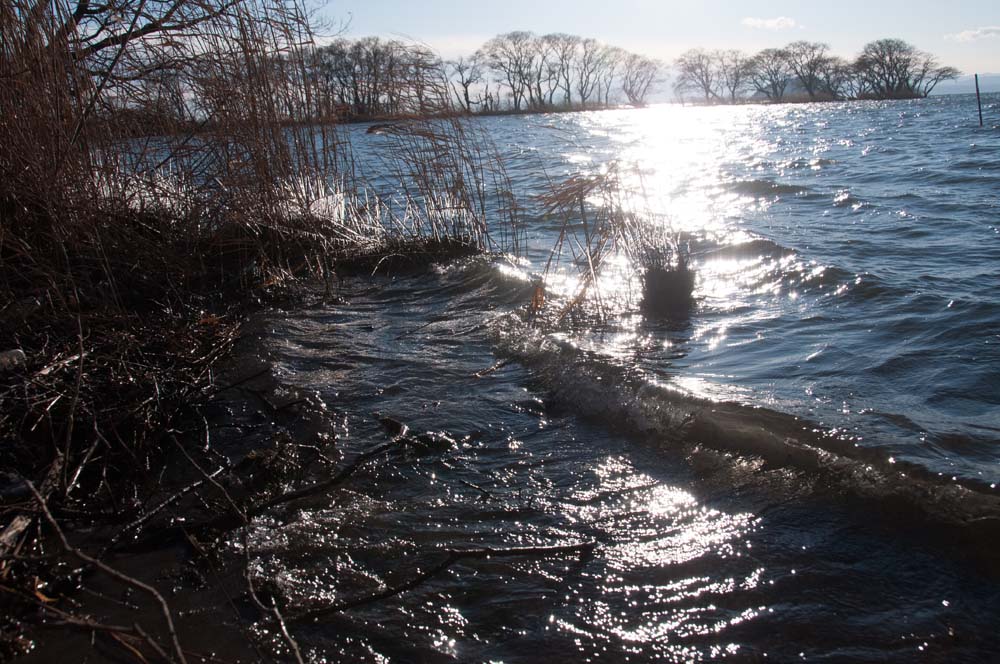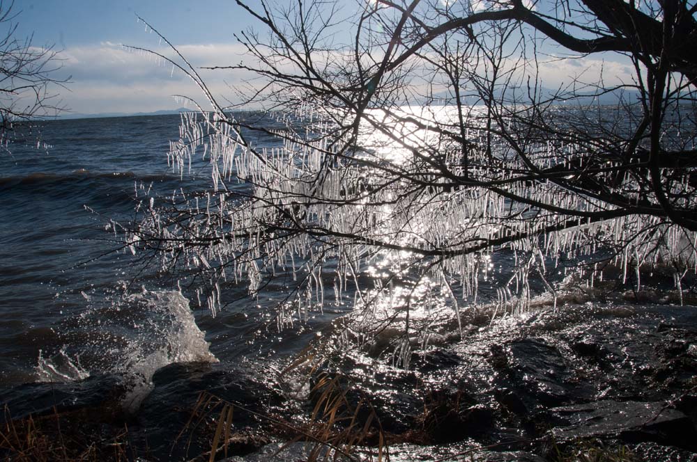 冬の余呉湖。凍てついた湖面に風がさざめき、岸辺の木々や岩に水しぶきがかかると、そこには“しぶき氷”が咲きはじめます。透明で繊細な氷の花は、冬の静寂の中に美しい緊張感を湛え、朝の光を受けて淡く輝いていました。