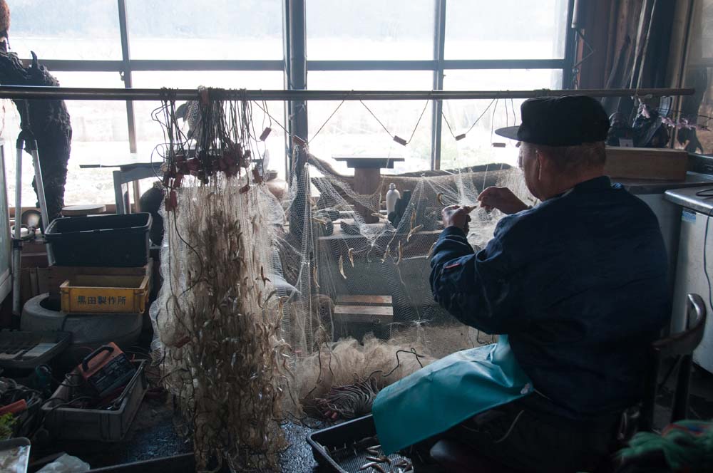 そのすぐ近く、小さな漁小屋の中では、漁師が冷たい指先で網からわかさぎを外していました。冬の恵みを、ひとつひとつ確かめるように手繰るその姿には、この湖と共に生きてきた人々の静かな誇りと技が感じられます。
